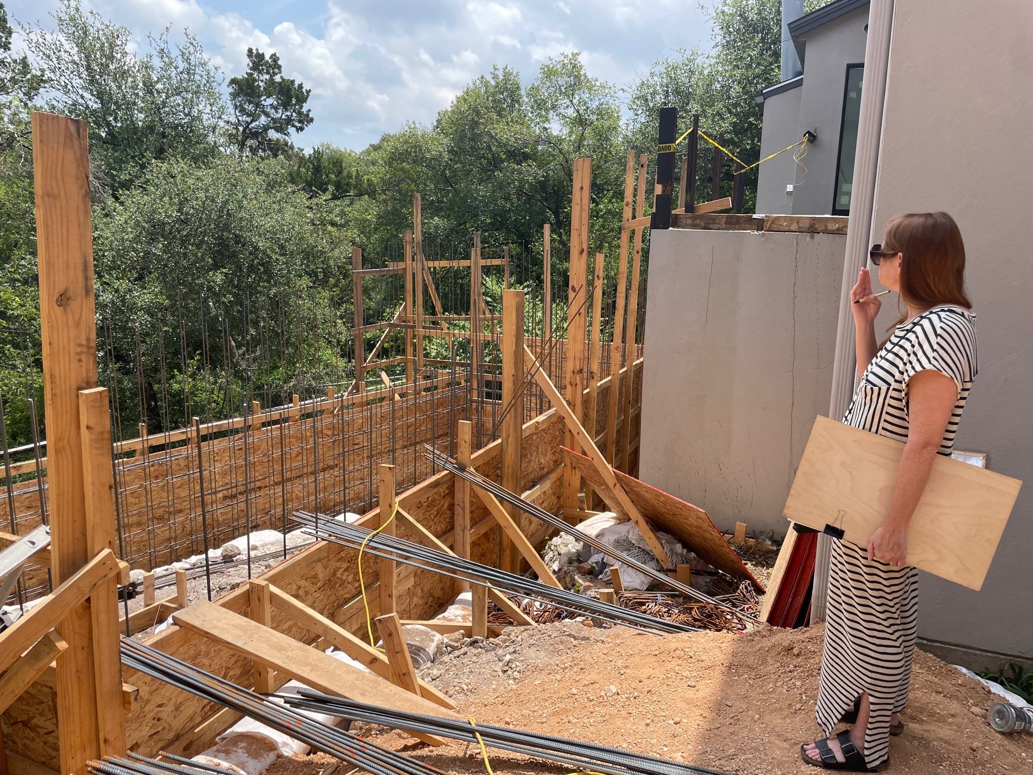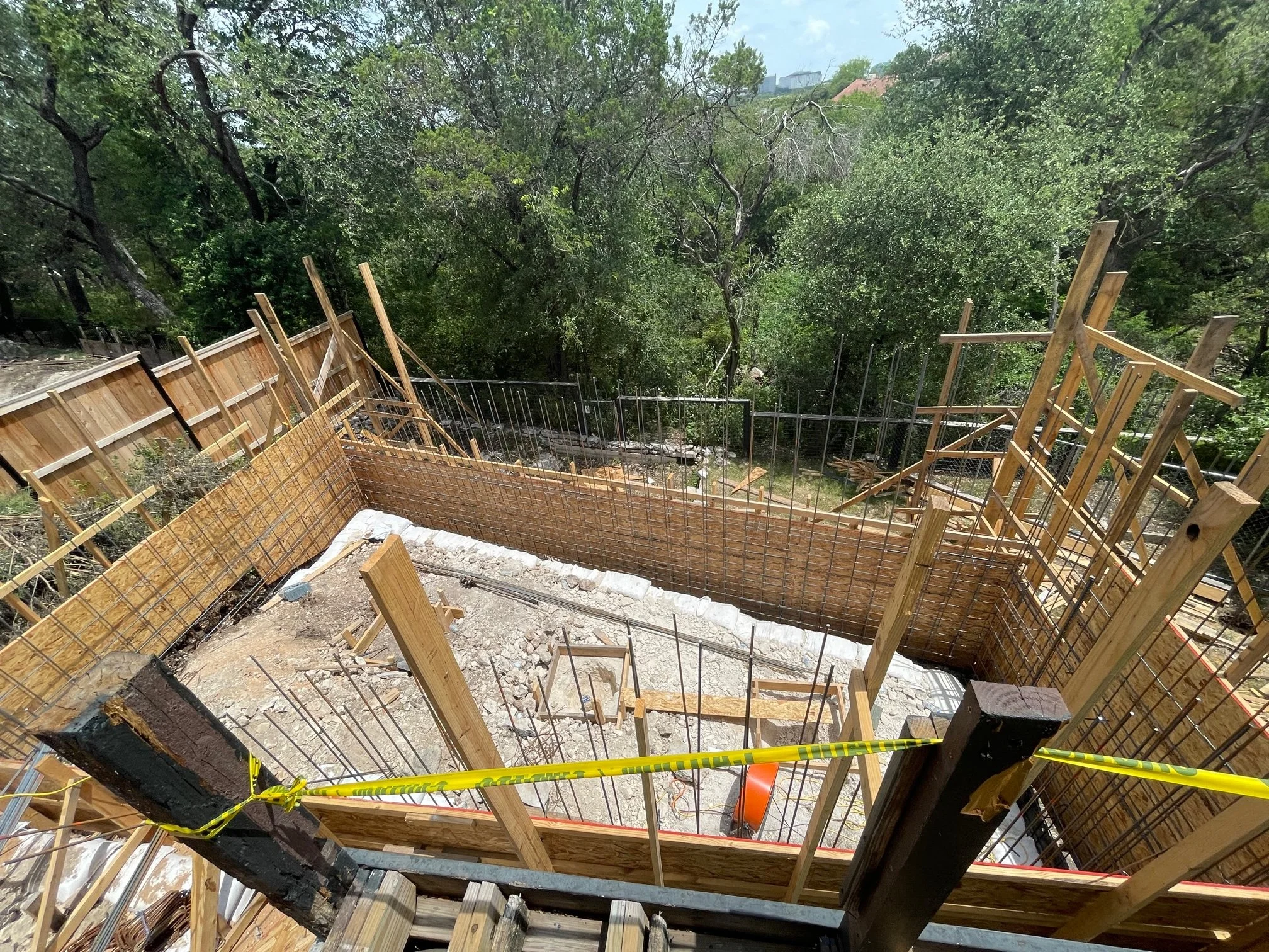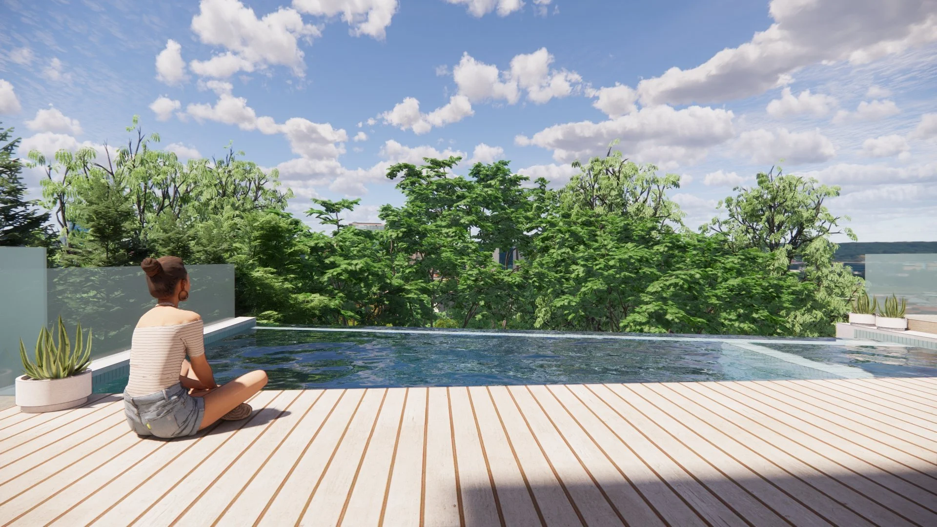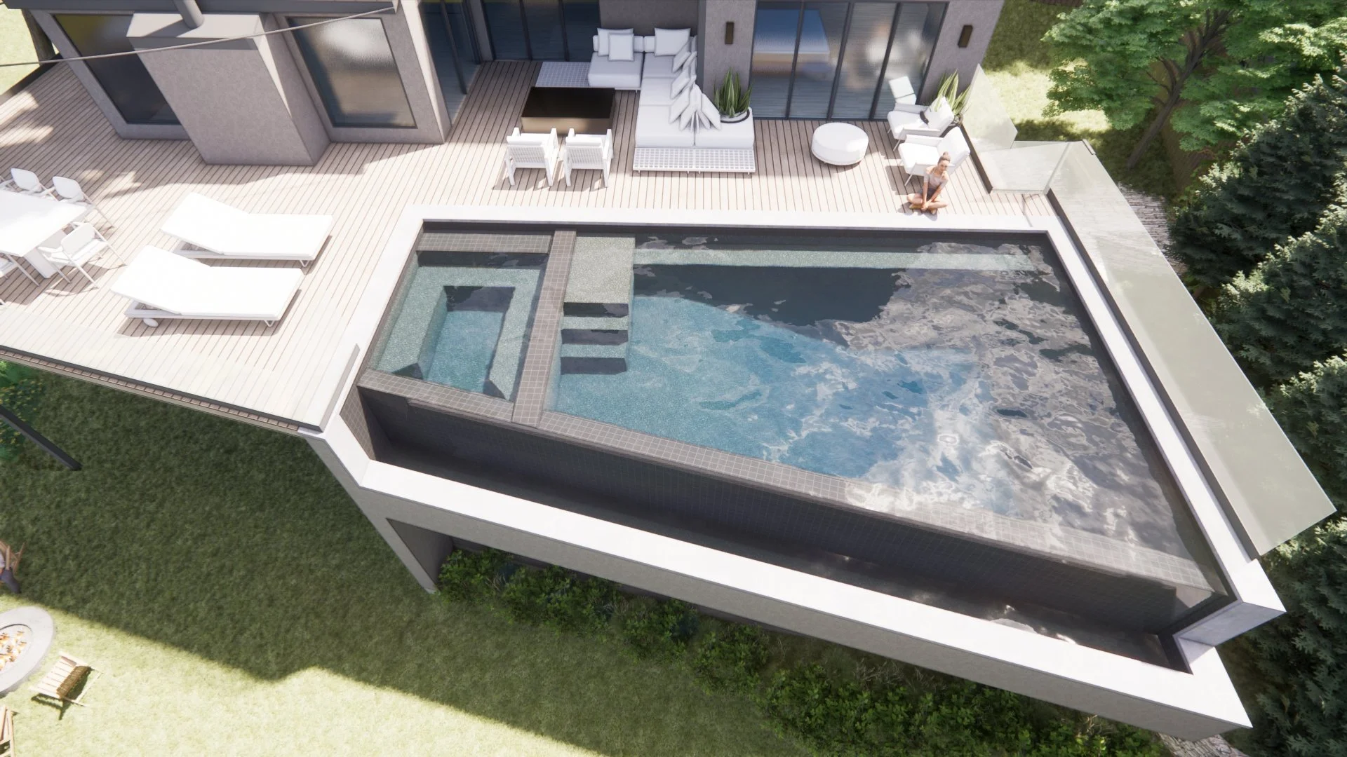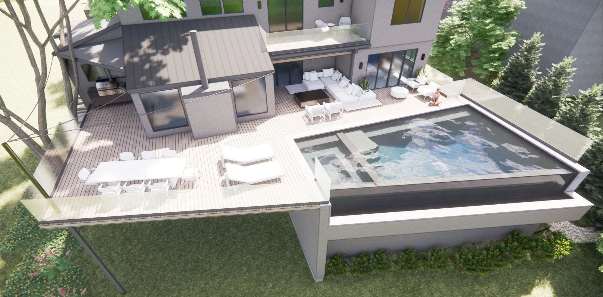 DESCRIPTION: DOB&EEL was asked to help develop a swimming pool and outdoor deck at the back of the house. The site is steeply sloping and the front entry and living spaces of the house are all on the middle level, so we designed a raised pool and deck up at that level. The house backs up to green space and views, so we composed the pool with an infinity edge to the views would remain seamless, mirroring the trees and sky. It will be a dramatic increase to the useable outdoor space of the house.