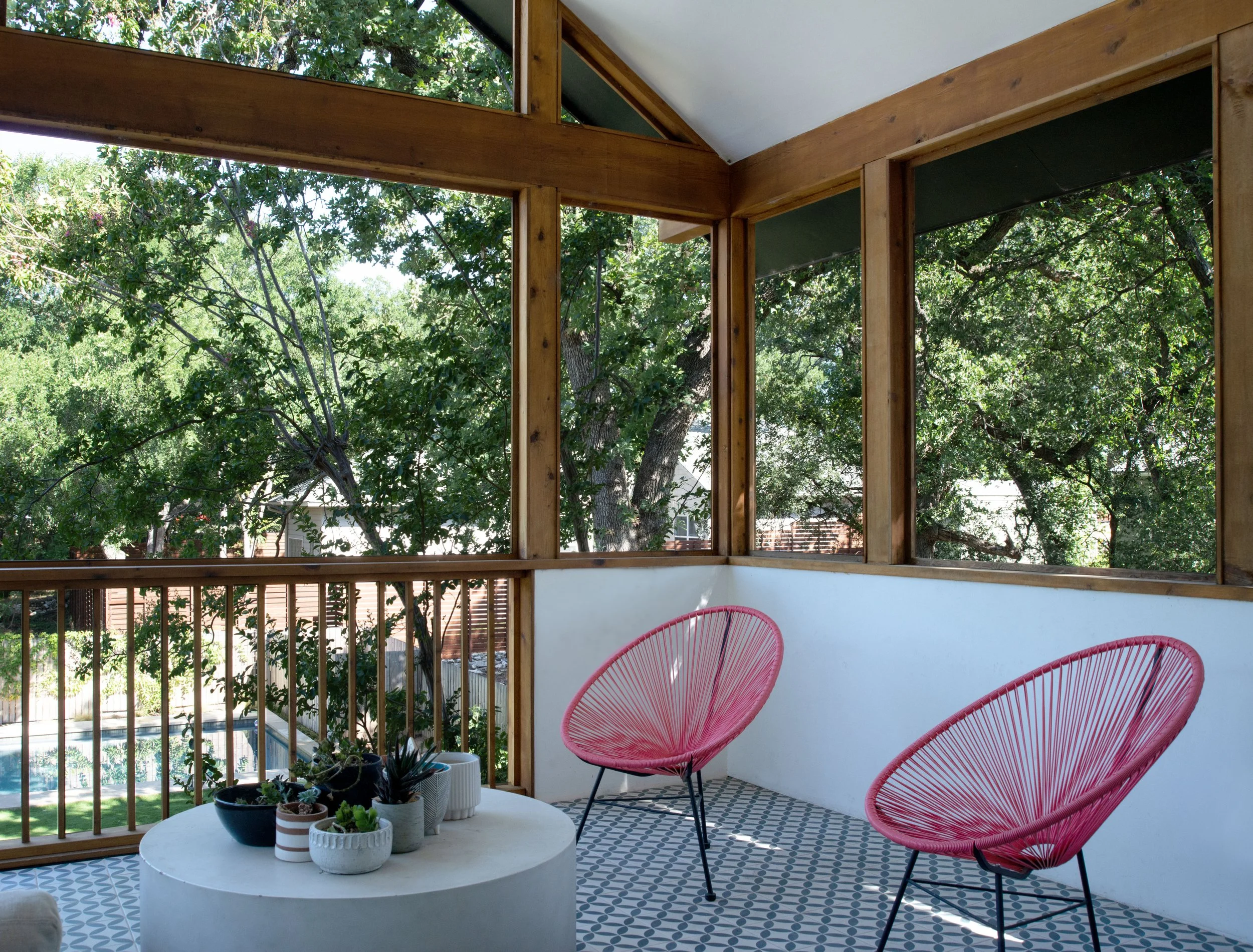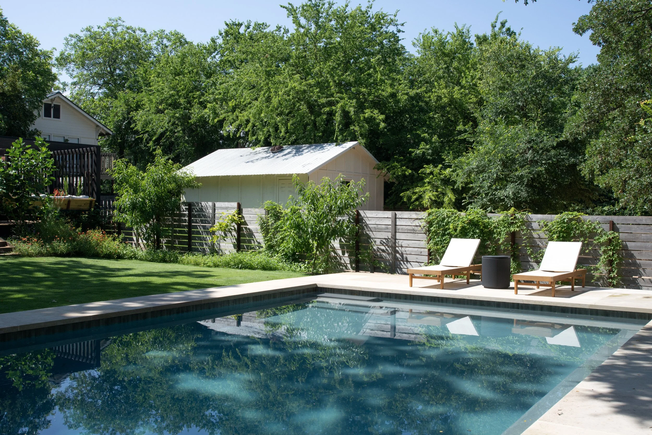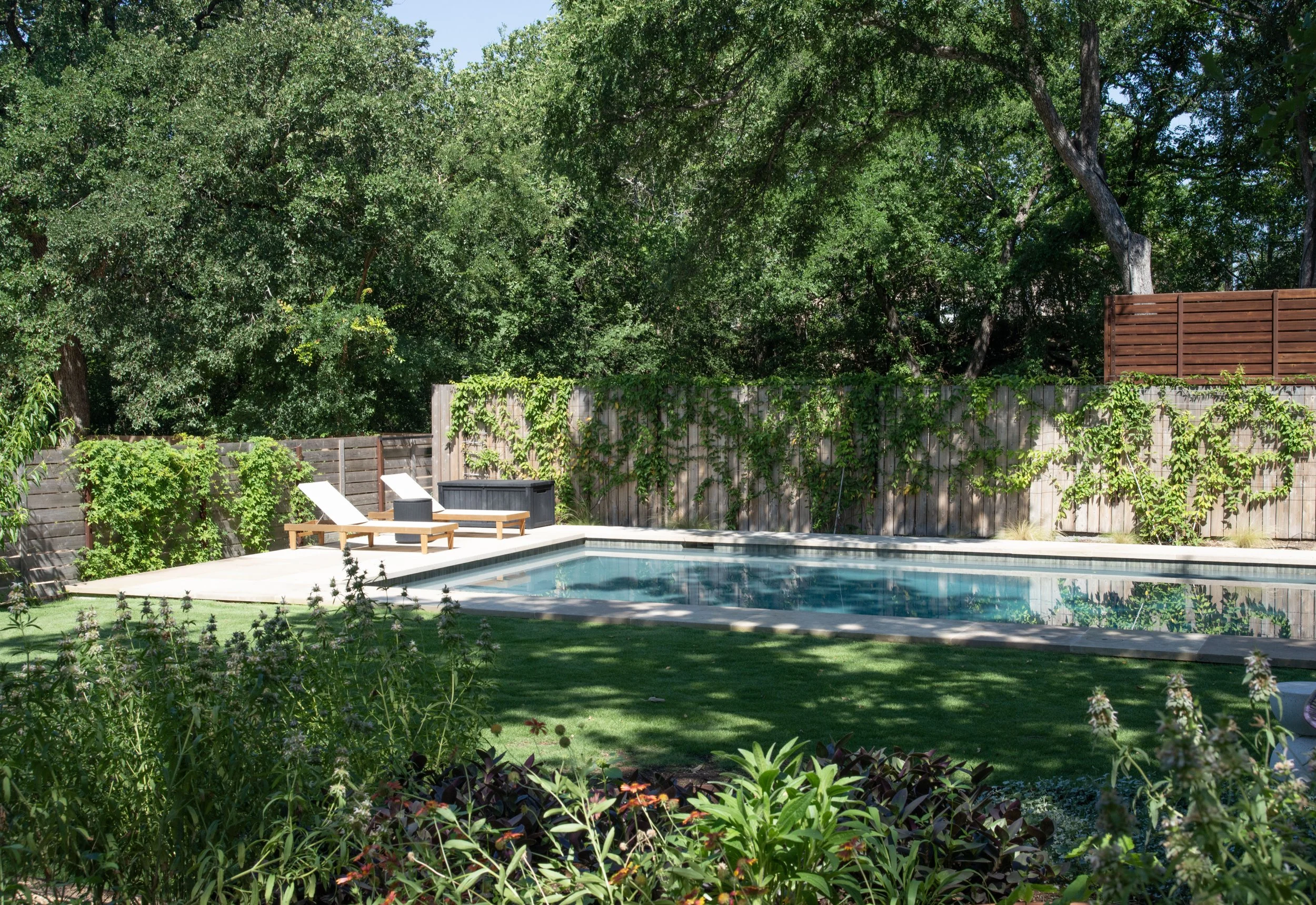 The covered back porch looks out over a lush green backyard, carefully landscaped by the owners. The pool at the very back of the lot is like a quiet oasis in the forest. It’s hard to believe it’s just a stones throw from downtown Austin.