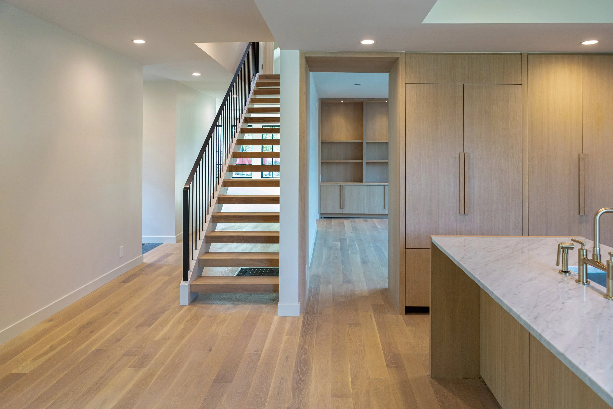 A major renovation to a 100-year-old house in the historic Clarksville district of Austin, transforming an old triplex into a new single family home. We also designed a pool for the backyard. The first step was peeling back the many different remodels and additions the house had undergone over the years to give it a fresh start. The front facade is relatively unchanged formally, but the color went from white to black. Inside, one is drawn through sitting and dining spaces, past an open wood staircase, to the sunny kitchen, living room and back porch.