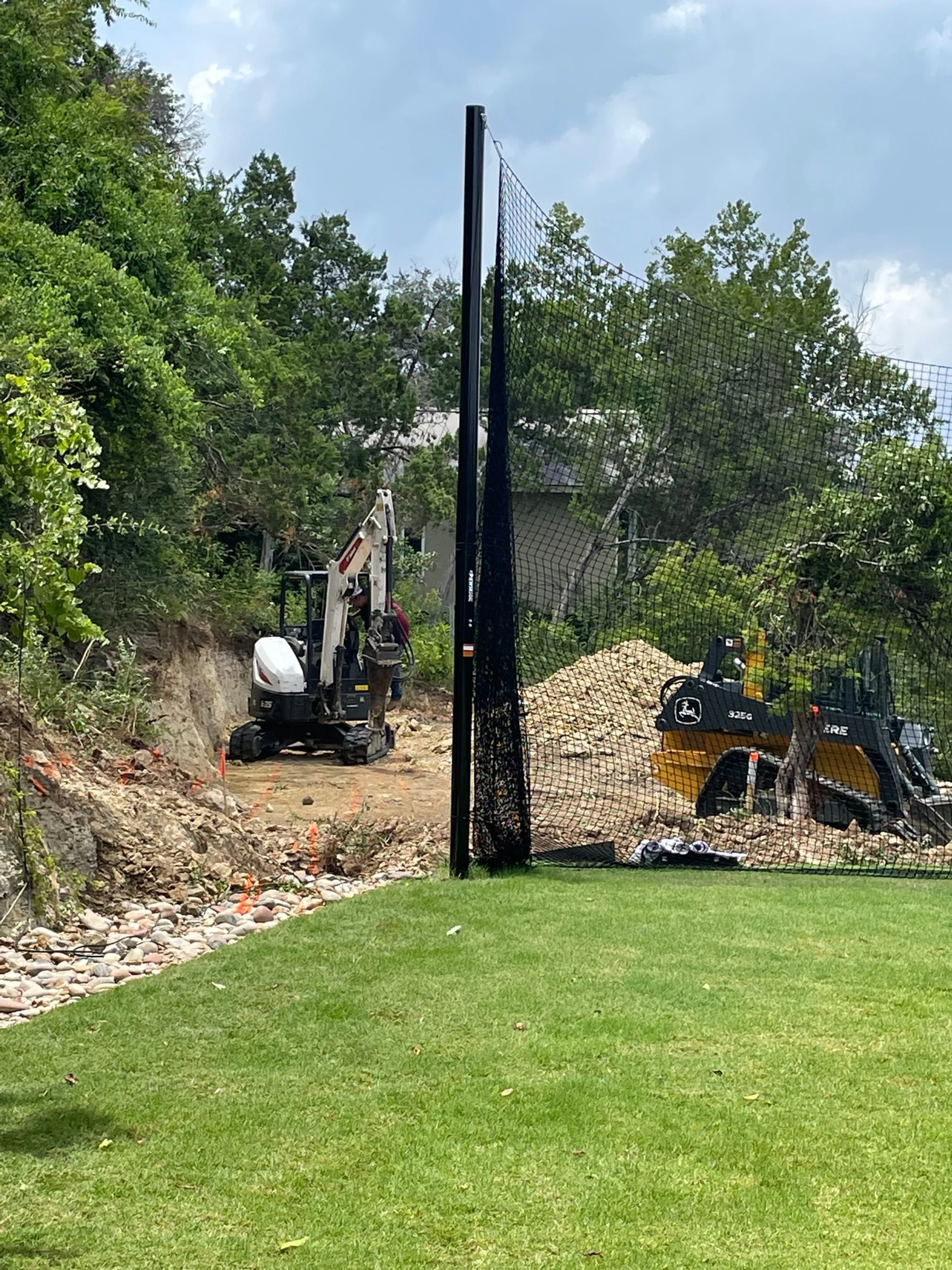 The clients are an active family of four, always outdoors and playing sports. But the house sits on a steep hillside, so finding flat yard space is a challenge. In addition to the fitness space, we were also asked to help landscape and expand the one flat area on site, in order to create a small soccer field and “sport court” for pickleball and basketball.